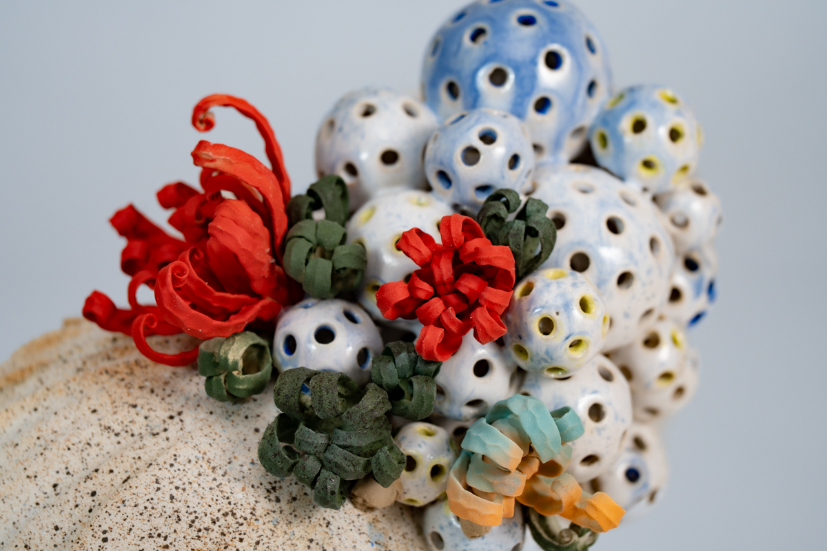 閉上眼睛,微笑仰望,頭頂的花朵隨著夢想一同盛開。色彩斑斕的球體彷彿思緒的種子,在空氣中漂浮、遊走,向未知的天空擴散。
