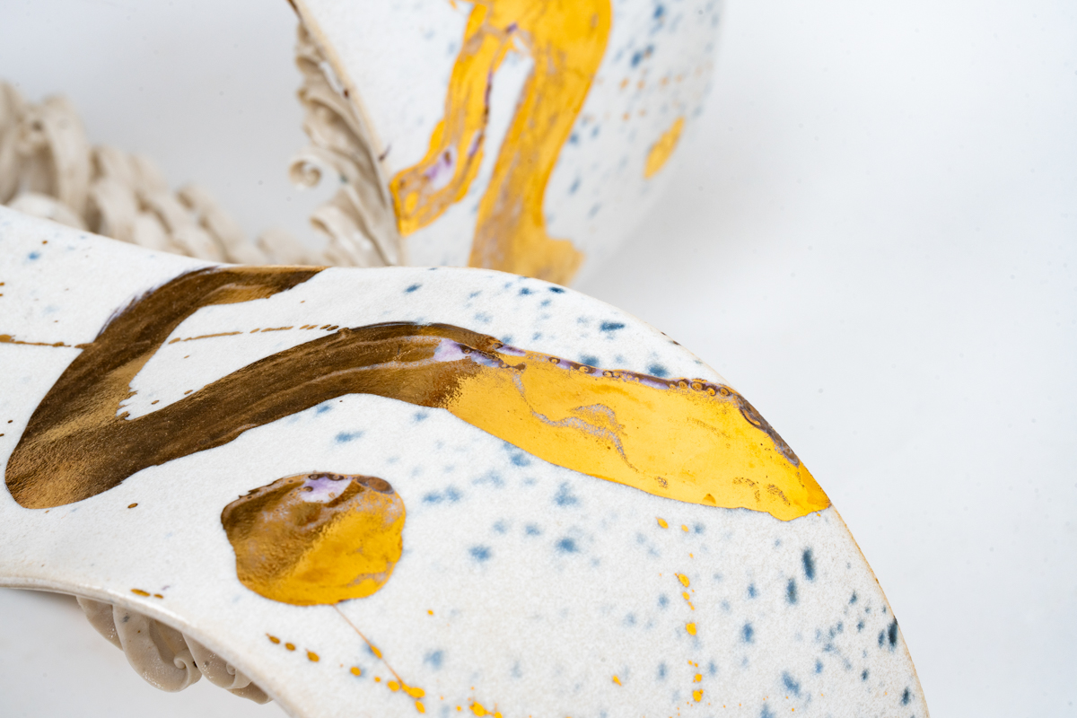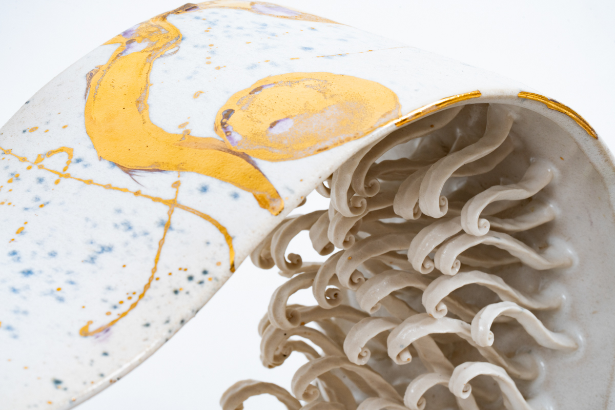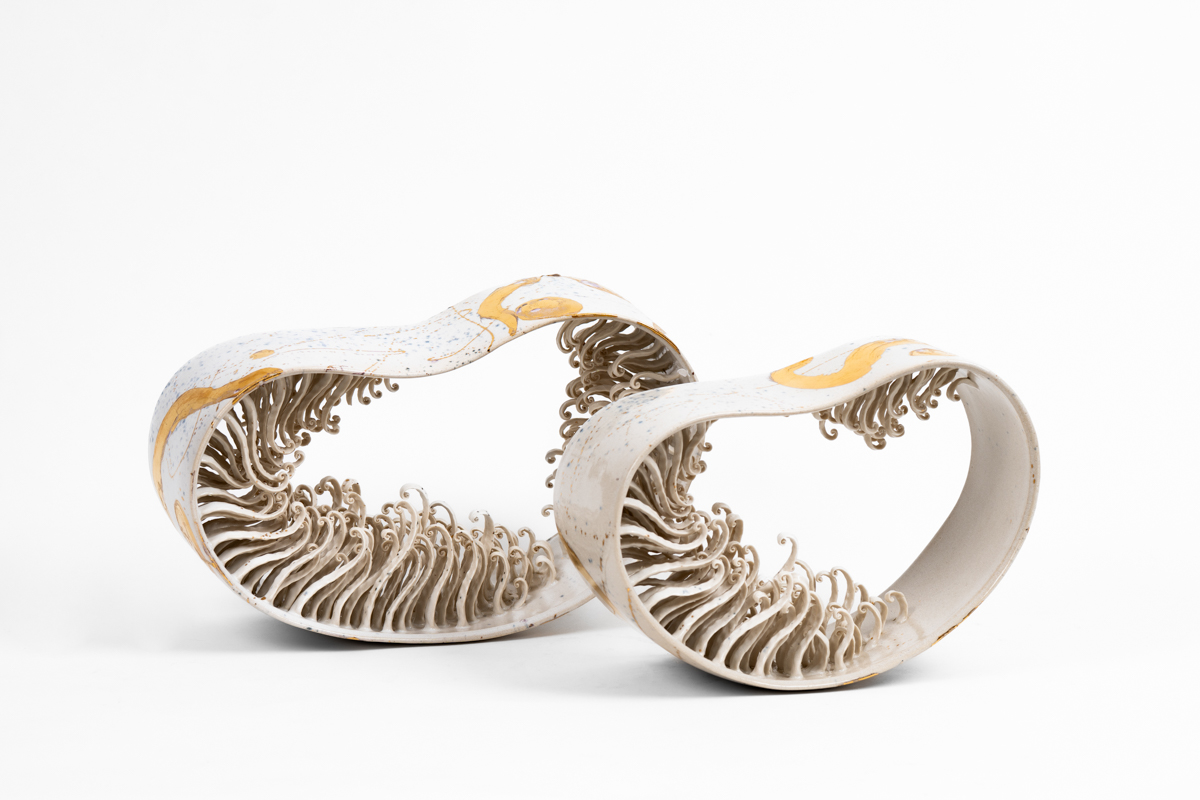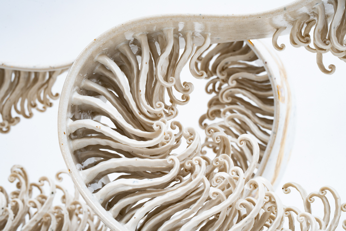 環狀的弧線相互交織,如時間的軌跡彼此纏繞。內部綻放出細緻的蕨葉形態,彷彿記錄著生命的脈動。純白的色澤帶來清澈與靜謐,卻又隱含著歷程中累積的光輝。它象徵生命裡最燦爛的階段,不僅是年華的榮景,更是心靈成熟後的安定與光亮。