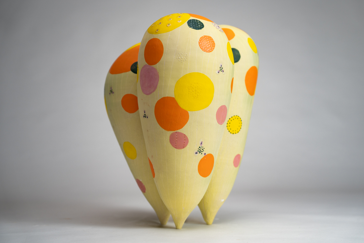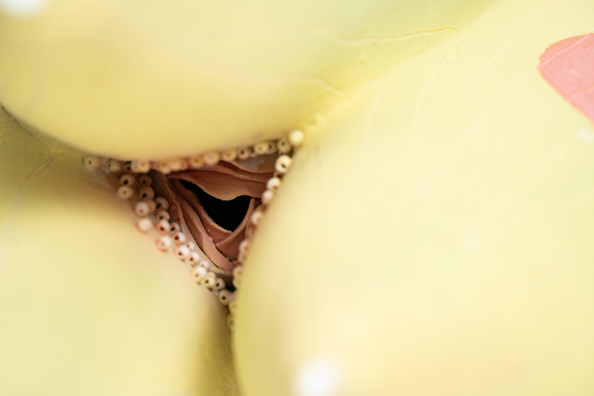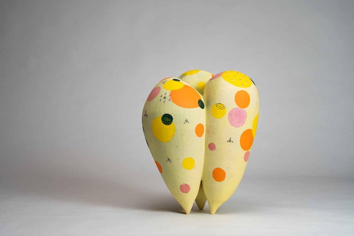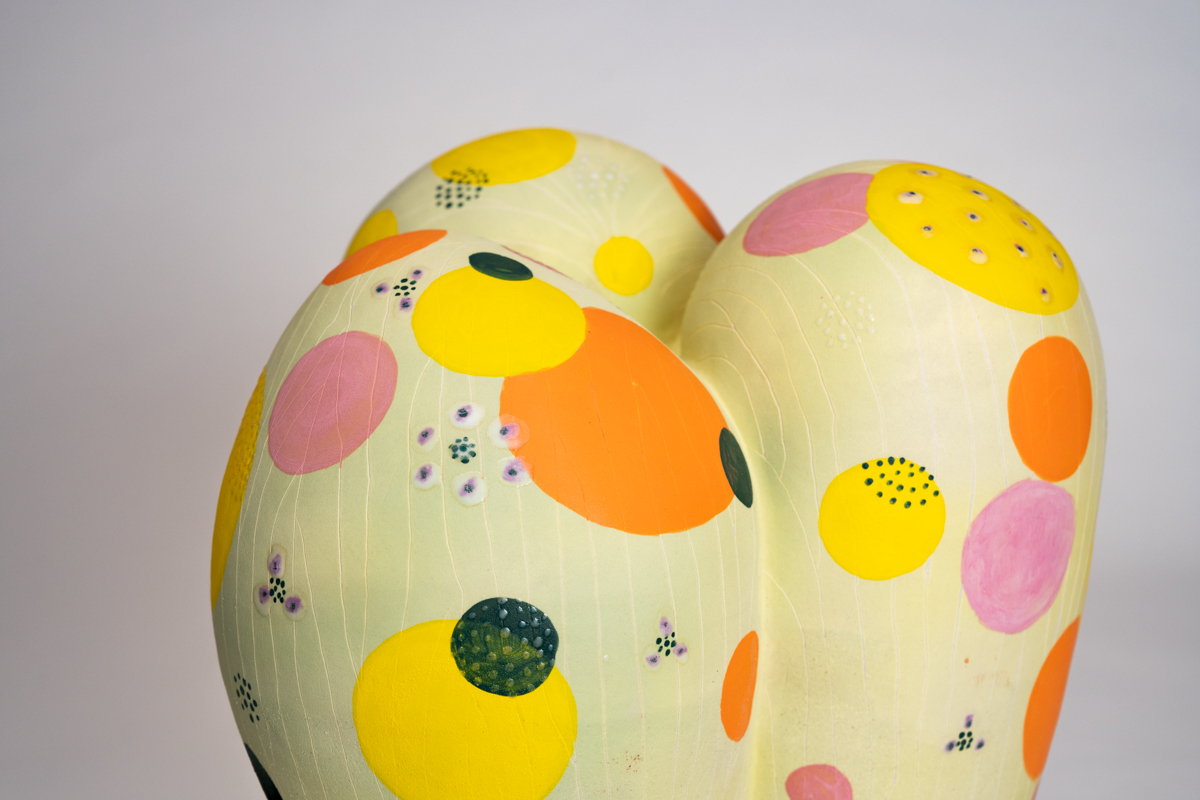 《宇宙花園》以柔軟卻堅實的曲線,形塑出一個生命的容器。作品下方的開口隱喻女性身體的陰道口,深處隱藏著小小種子,如同宇宙間的繁星,等待著被喚醒。